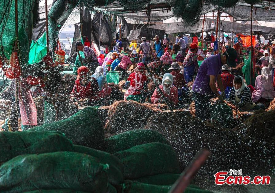 Workers are busy harvesting gracilaria, a genus of red algae, in a coastal mariculture zone in Rongcheng city, east China's Shandong Province. (Photo: China News Service/Li Xinjun)