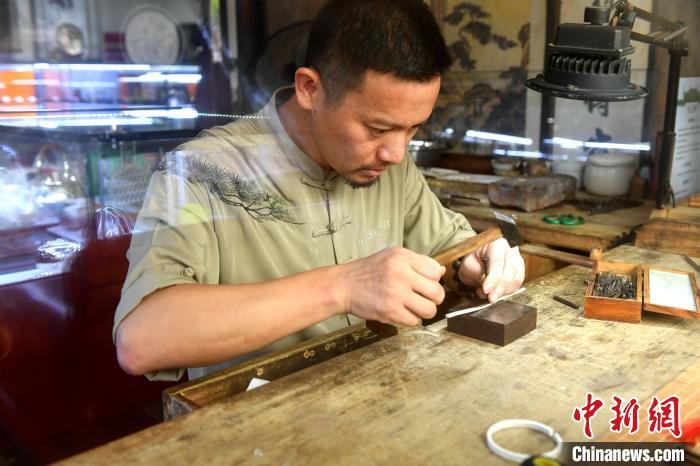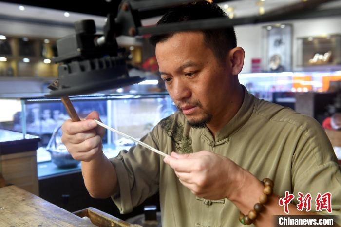 Photo shows Lin Weixing making a silver bracelet. (Photo/Lyu Ming)