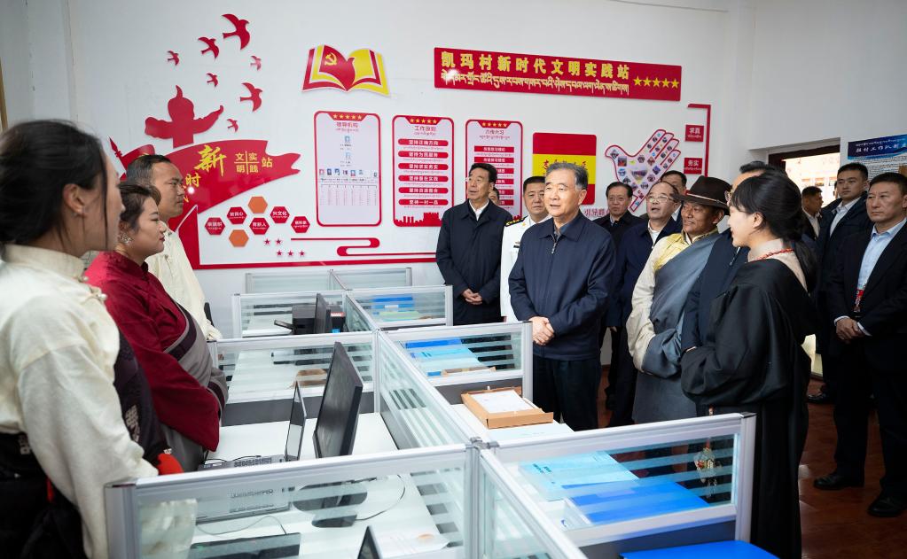 Wang Yang, a member of the Standing Committee of the Political Bureau of the Communist Party of China Central Committee and chairman of the National Committee of the Chinese People's Political Consultative Conference, who is leading a central delegation to Tibet, inspects the building of primary-level Party organizations in a local village in Nagqu, southwest China's Tibet Autonomous Region. Wang Yang, leading a division of the central delegation, visited the city of Nagqu on Aug. 20, 2021. (Xinhua/Huang Jingwen)