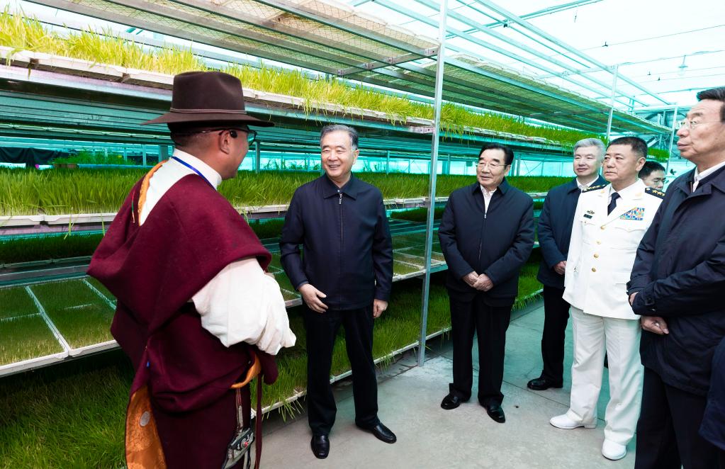 Wang Yang, a member of the Standing Committee of the Political Bureau of the Communist Party of China Central Committee and chairman of the National Committee of the Chinese People's Political Consultative Conference, who is leading a central delegation to Tibet, visits an ecological animal husbandry industry demonstration park and commends its efforts to help local people increase incomes in Nagqu, southwest China's Tibet Autonomous Region. Wang Yang, leading a division of the central delegation, visited the city of Nagqu on Aug. 20, 2021. (Xinhua/Huang Jingwen)