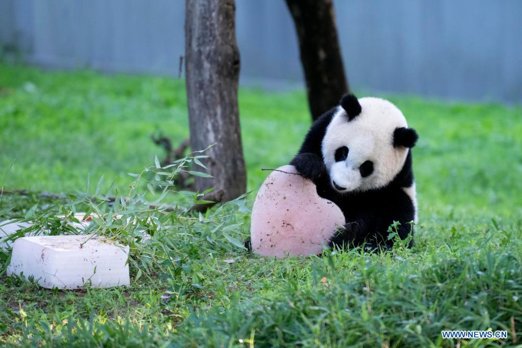 Giant panda cub "Xiao Qi Ji" enjoys an ice cake at Smithsonian's National Zoo in Washington, D.C., the United States, on Aug. 21, 2021. Xiao Qi Ji (little miracle), the giant panda cub born in the national zoo in Washington, D.C., turned one on Saturday, and the zoo held a big birthday party for the little cutie featuring ice cakes and other activities to celebrate the occasion with his avid fans coming for a visit. (Xinhua/Liu Jie)