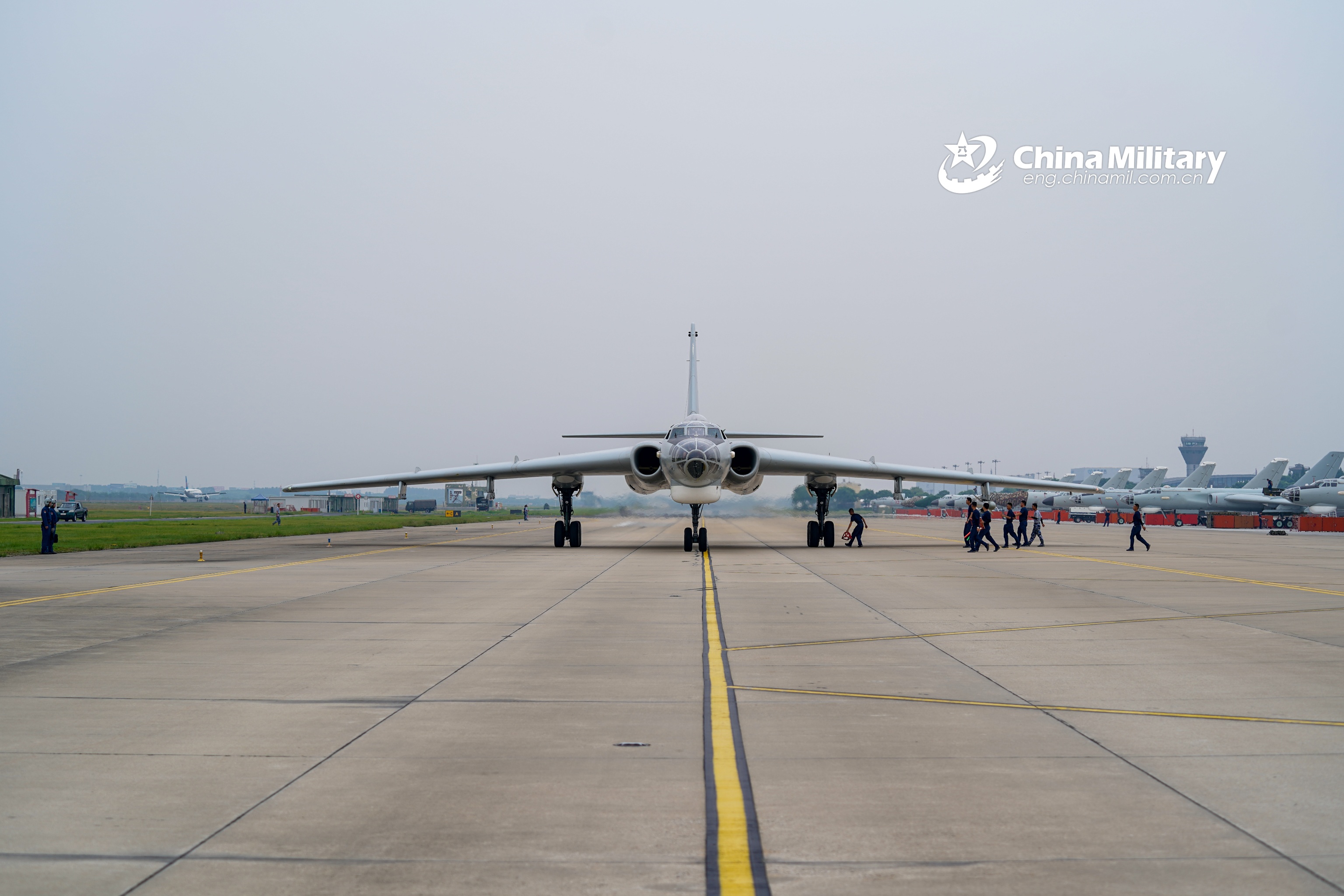 Maintenance crews assigned to an aviation regiment of the PLA Navy perform rapid inspections on a bomber on the runway before takeoff during a realistic round-the-clock flight training exercise on August 9, 2021. The training contains multiple subjects such as shock tactics against ground and sea targets, flight-refueling operations and so on. (eng.chinamil.com.cn/Photo by Yang Ling)