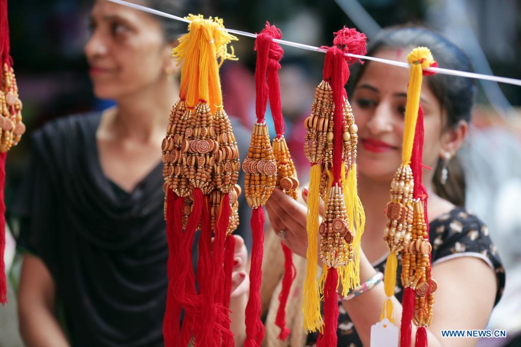 A woman shops for rakhis, or sacred threads, in a market ahead of Raksha Bandhan festival in Amritsar district of India's northern state Punjab, Aug. 21, 2021. Raksha Bandhan is celebrated every year by the tying of a thread on the wrist of a brother by his sister as a mark of bond and ritual protection. (Str/Xinhua)