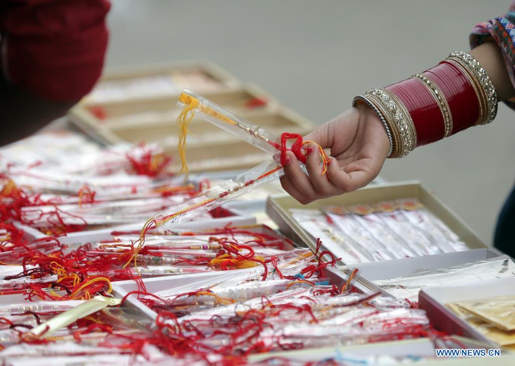 A woman shops for rakhis, or sacred threads, in a market ahead of Raksha Bandhan festival in Amritsar district of India's northern state Punjab, Aug. 21, 2021. Raksha Bandhan is celebrated every year by the tying of a thread on the wrist of a brother by his sister as a mark of bond and ritual protection. (Str/Xinhua)