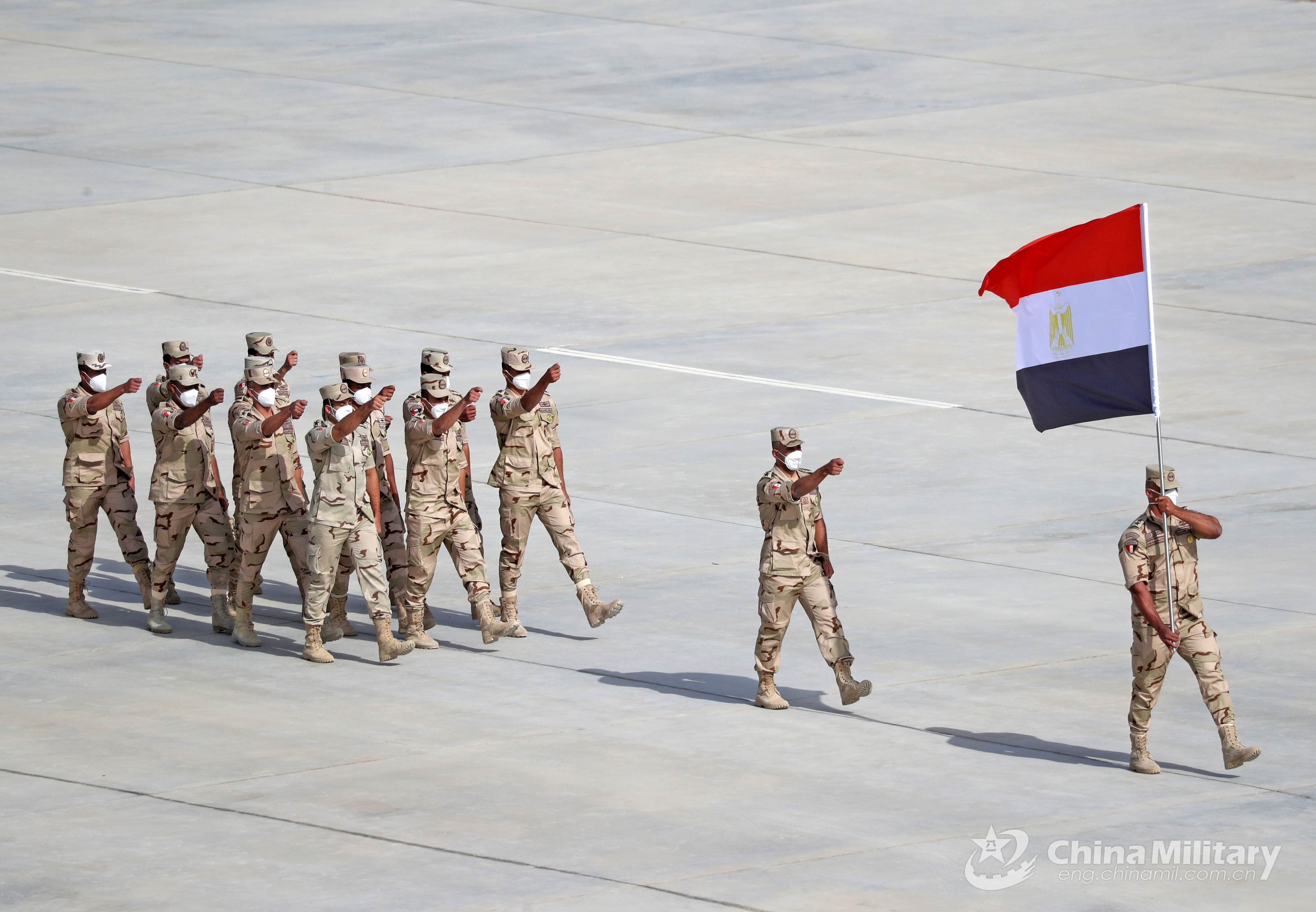 The opening ceremony of three competitions of the International Army Games (IAG) 2021 is held at the "Suvorov Attack" competition venue in Korla, northwest China's Xinjiang Uygur Autonomous Region, on August 22, 2021. The picture shows the Egyptian participating troops march past the reviewing stand at the ceremony. (Photo by Luo Xingcang)