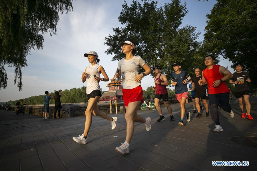 You Jia (1st L), a nurse of Peking Union Medical College Hospital, takes a morning run with running friends near the watch tower of the Forbidden City, in Beijing, capital of China, Aug. 8, 2020. (Xinhua/Li Ming)