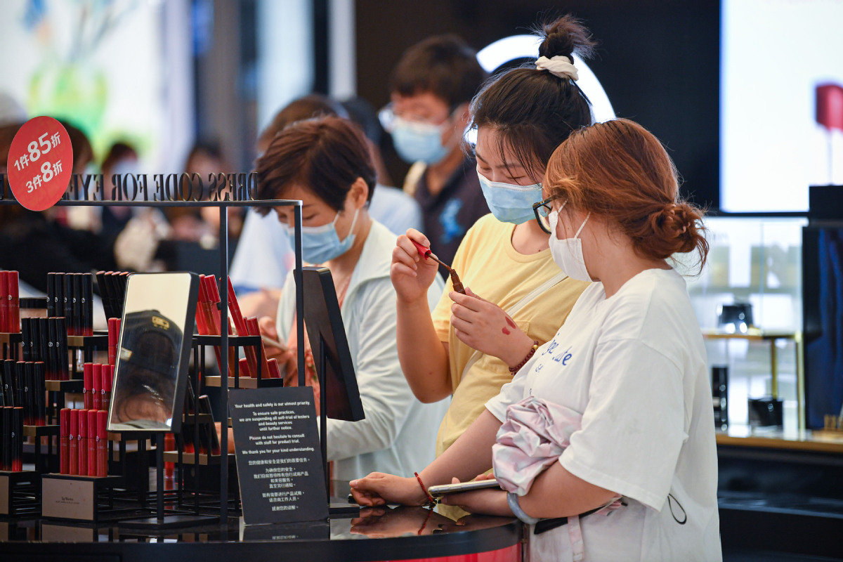 Shoppers browse cosmetics at a duty-free store in Haikou, Hainan province, in April. [Photo/Xinhua]