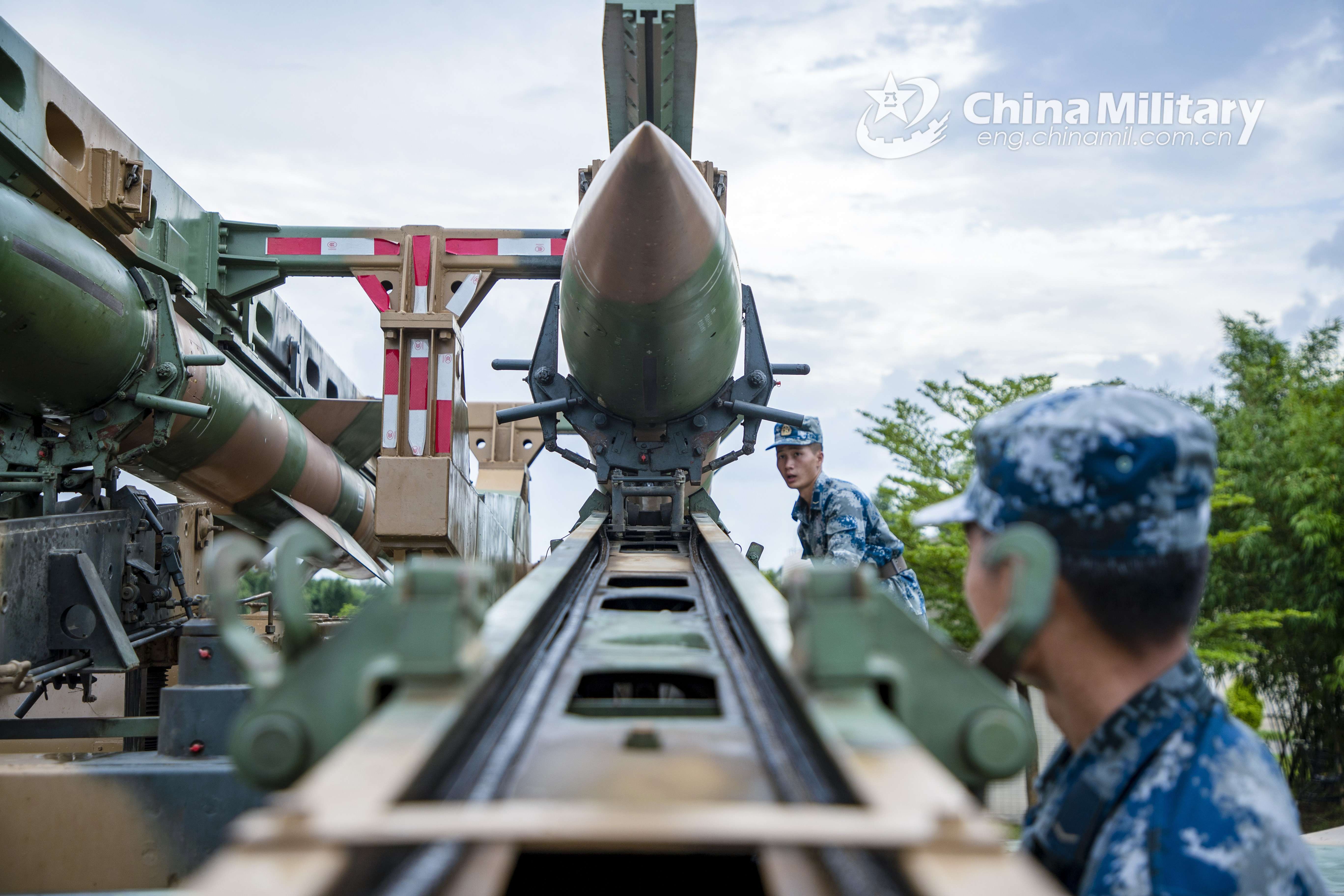Airmen assigned to an air-defense brigade with the air force under the PLA Southern Theater Command practice loading missiles onto a missile launching vehicle during a field training on August 11, 2021. (eng.chinamil.com.cn/Photo by Pei Jun)