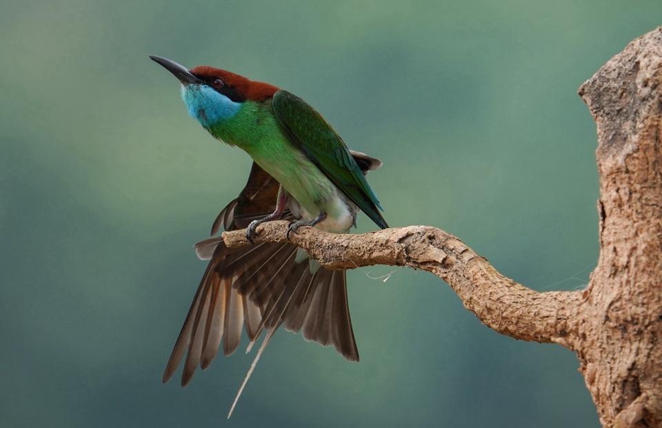 | A blue-throated bee-eater is about to take off. (Photo/Li Guochao) |