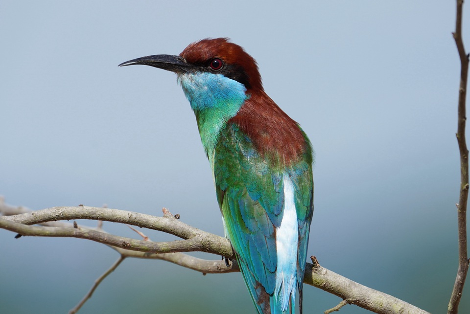| A blue-throated bee-eater perches on a tree branch in the Liangye Mountain National Nature Reserve, southeast China's Fujian province. (Photo/Li Guochao) |