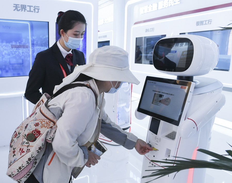 A visitor interacts with a smart banking robot at the service robots exhibition area of the 2020 China International Fair for Trade in Services in Beijing, capital of China, Sept. 5, 2020. (Xinhua/Lu Peng)