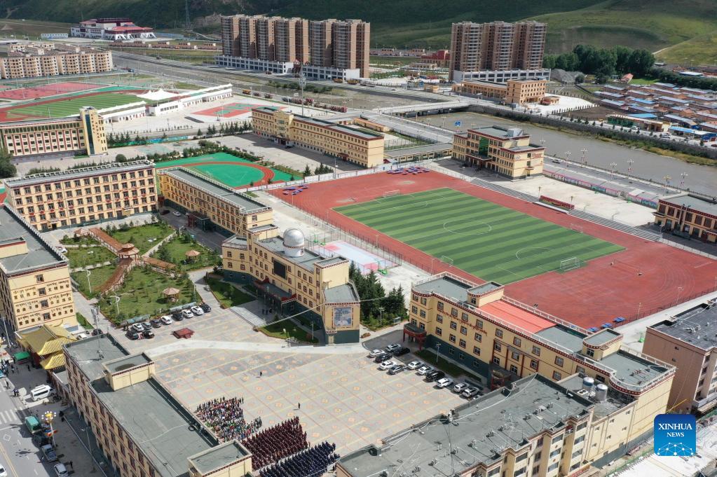 Aerial photo taken on Aug. 30, 2021 shows Luqu Tibetan Middle School in Luqu County, Gannan Tibetan Autonomous Prefecture, northwest China's Gansu Province. Located at an altitude of 3,200 meters, Luqu Tibetan Middle School is the only boarding school in Luqu County, with more than 2,500 students studying and living at the school. The students are mostly from grassland and pastoral areas. The school greeted its new semester on Monday with precautionary measures against the COVID-19. (Xinhua/Du Zheyu)
