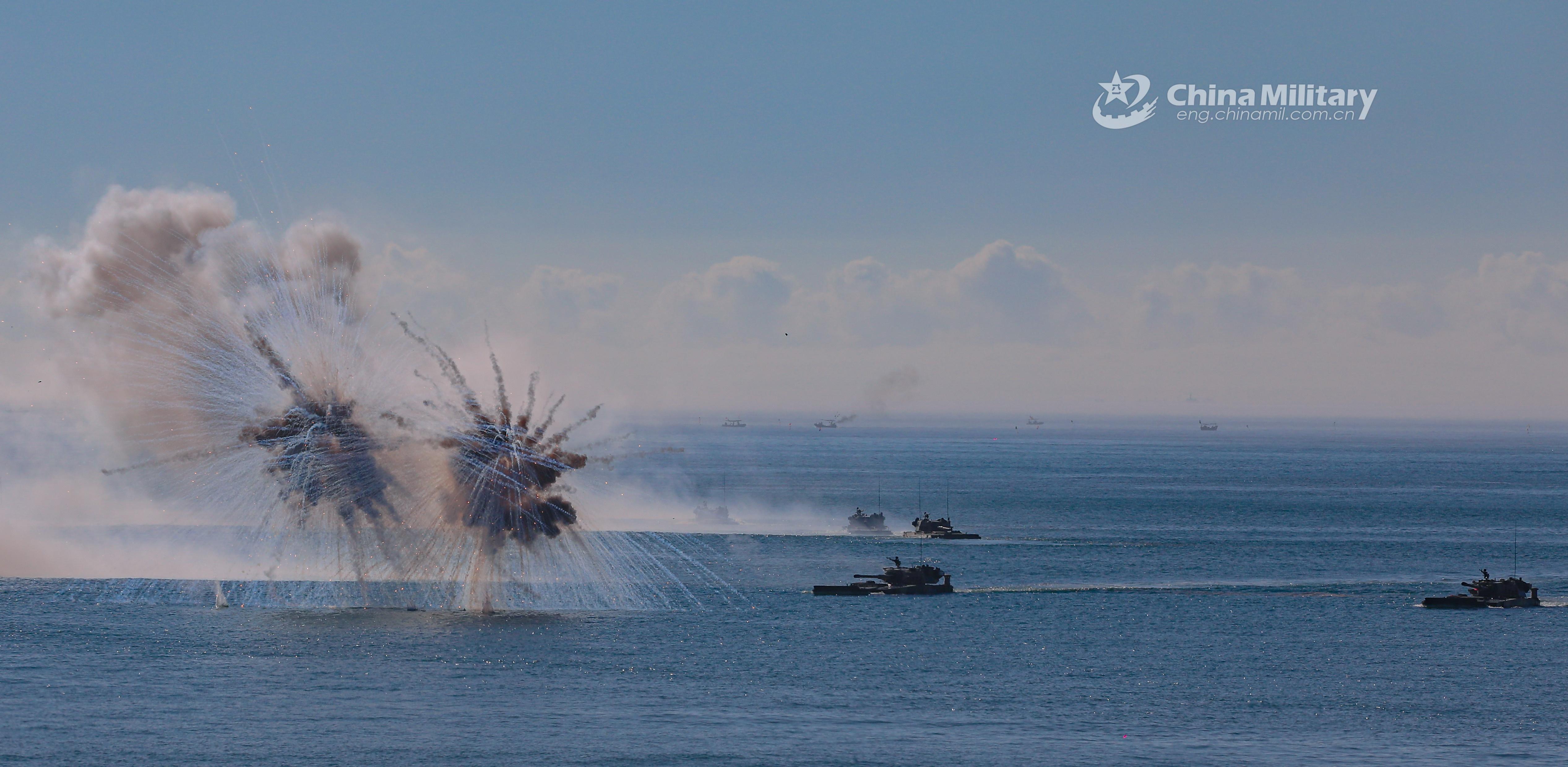 Amphibious armored vehicles attached to a brigade of the army under the PLA Eastern Theater Command release smoke bombs for concealment during a recent amphibious training exercise. The Army brigade has organized amphibious landing drills on subjects of landing craft ferrying, assault wave formation, beach-landing, obstacle breaking and so on. (eng.chinamil.com.cn/Photo by Zeng Bingyang)
