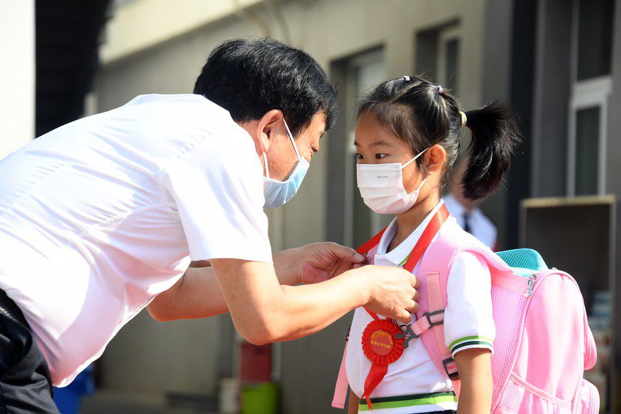 A teacher greets a first-year student with a flower-shaped badge at the Taipinglu Primary School in Beijing, capital of China, Sept. 1, 2021. (Xinhua/Ren Chao)