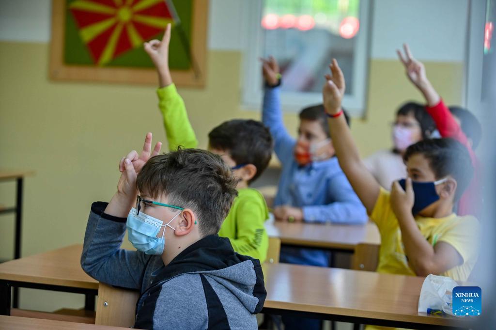 Pupils are seen on their first day of school in Skopje, North Macedonia, on Sept. 1, 2021. (Photo by Tomislav Georgiev/Xinhua)