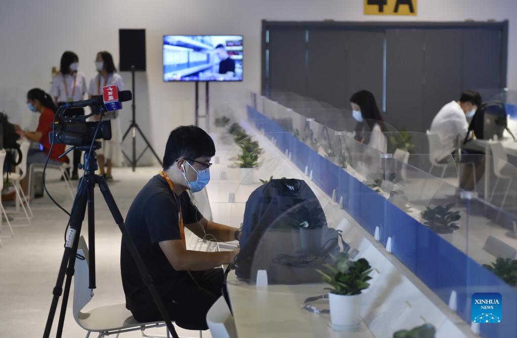 Journalists work at the media center of the China International Fair for Trade in Services (CIFTIS) at the China National Convention Center in Beijing, capital of China, Sept. 1, 2021. The media center of the CIFTIS started trial operation on Wednesday. The CIFTIS is to be held from Sept. 2 to 7 this year. (Xinhua/Lu Peng)