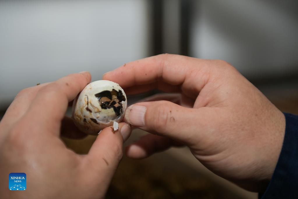 A baby Chinese alligator breaks its eggshell at the Anhui Chinese alligator national nature reserve in Xuancheng City, east China's Anhui Province, Aug. 31, 2021. More than 1,000 artificially-bred Chinese alligators at the Anhui Chinese alligator national nature reserve entered their hatching period in recent days. (Xinhua/Han Xu)