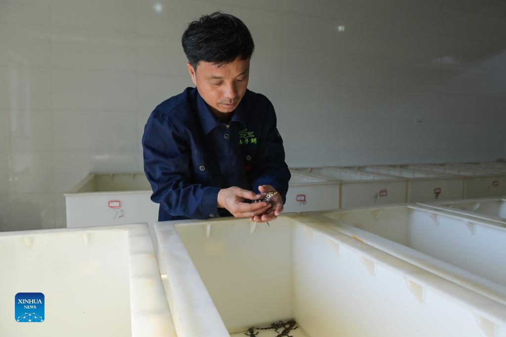 A staff member checks the condition of baby Chinese alligators at the Anhui Chinese alligator national nature reserve in Xuancheng City, east China's Anhui Province, Aug. 31, 2021. More than 1,000 artificially-bred Chinese alligators at the Anhui Chinese alligator national nature reserve entered their hatching period in recent days. (Xinhua/Han Xu)