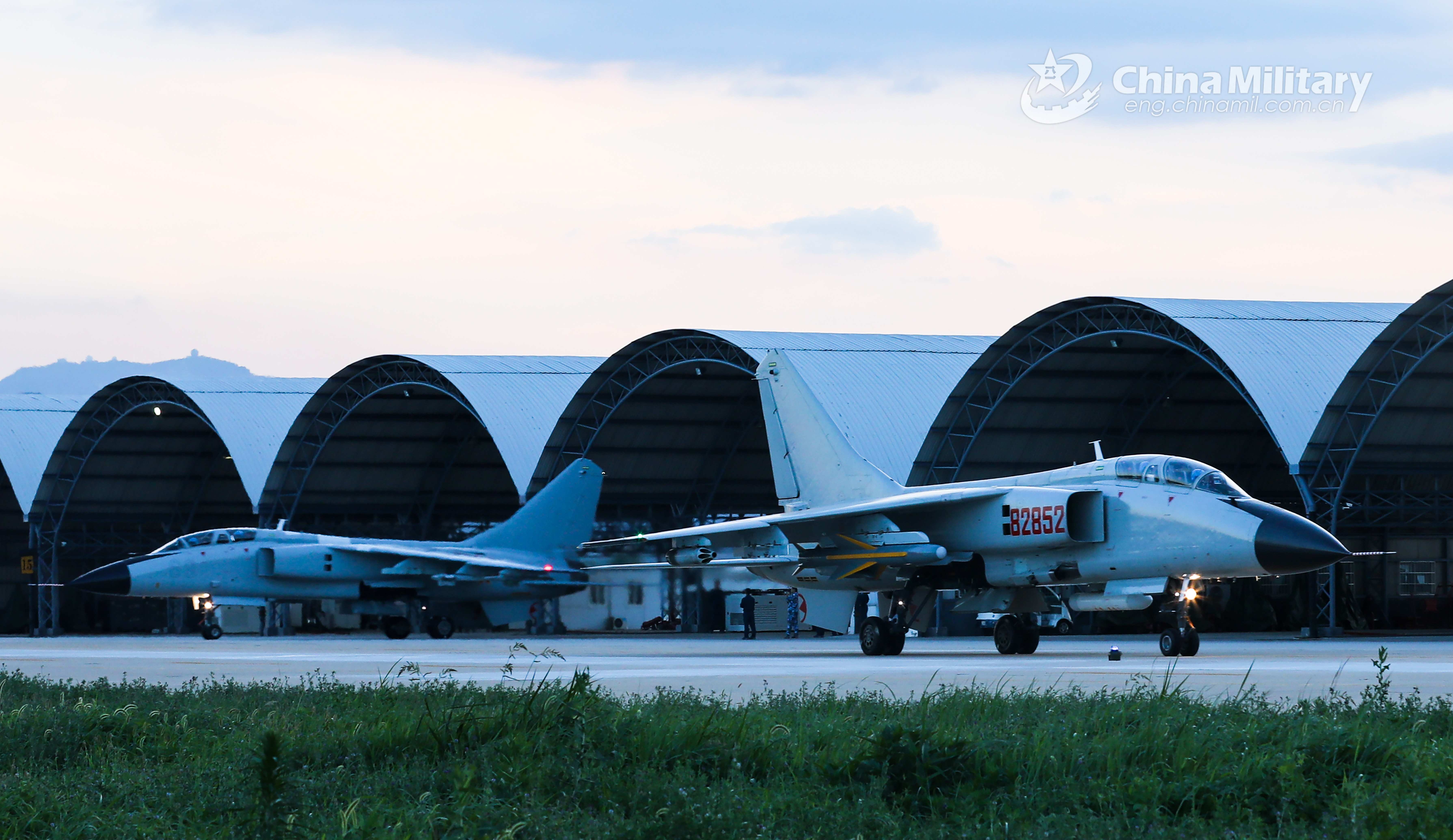 Fighter bombers attached to a naval aviation brigade under the PLA Northern Theater Command taxi out of the aircraft hangars for a recent round-the-clock flight training exercise. (eng.chinamil.com.cn/Photo by Yu Zhengqing and Zhang Qiang)