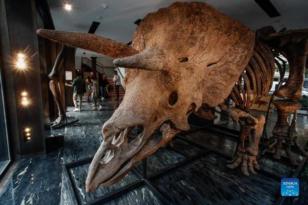 A skeleton of a triceratops is exposed ahead of its auction sale at Drouot auction house in Paris, France, Sept. 1, 2021. "Big John", the triceratops with an 8-meter long skeleton, is on display in Paris until Oct. 20, before be auctioned. (Photo by Aurelien Morissard/Xinhua)