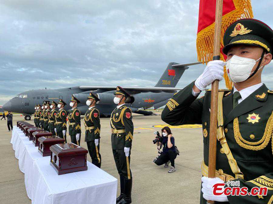A transfer ceremony is held at the Incheon International Airport, west of the South Korean capital Seoul, to hand over the remains of 109 Chinese soldiers who died during the War to Resist U.S. Aggression and Aid Korea (1950-53), Sept. 2, 2021. The plane carrying the remains and related relics was scheduled to land in Shenyang, northeast China's Liaoning Province, on Thursday morning. (Photo: China News Service/Liu Xu)