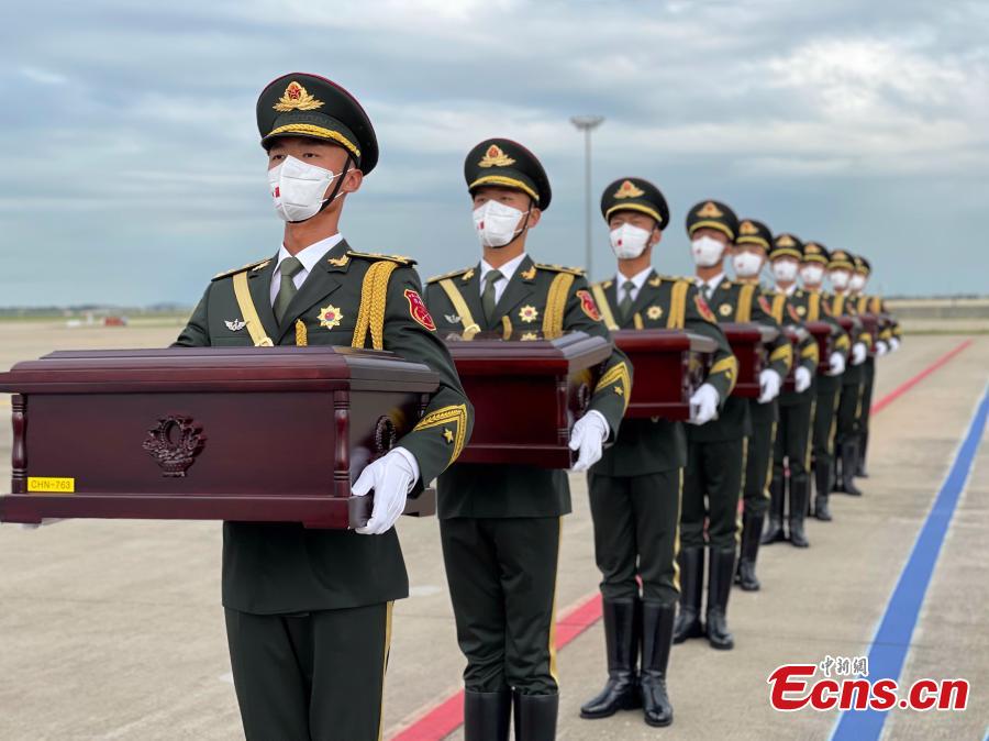 A transfer ceremony is held at the Incheon International Airport, west of the South Korean capital Seoul, to hand over the remains of 109 Chinese soldiers who died during the War to Resist U.S. Aggression and Aid Korea (1950-53), Sept. 2, 2021. The plane carrying the remains and related relics was scheduled to land in Shenyang, northeast China's Liaoning Province, on Thursday morning. (Photo: China News Service/Liu Xu)