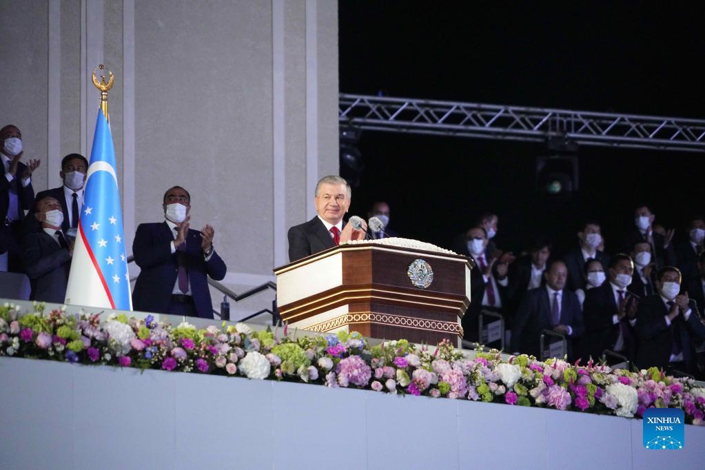 Uzbek President Shavkat Mirziyoyev speaks during a celebration of the country's 30th anniversary of independence, in Tashkent, Uzbekistan, on Sept. 1, 2021. Uzbekistan became independent in 1991, and Sept. 1 of each year is Independence Day. (Photo by Zafar Khalilov/Xinhua)