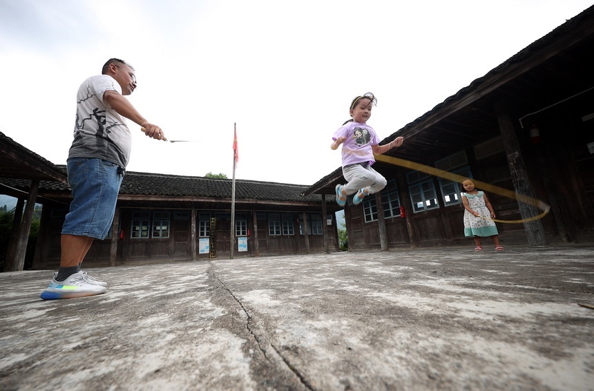 Yang Changjun plays skipping rope with students during a break at the teaching center in Danggan village, Paidiao town, Danzhai county in southwest China's Guizhou Province on Sept. 1, 2021. (Photo/People's Daily Online)