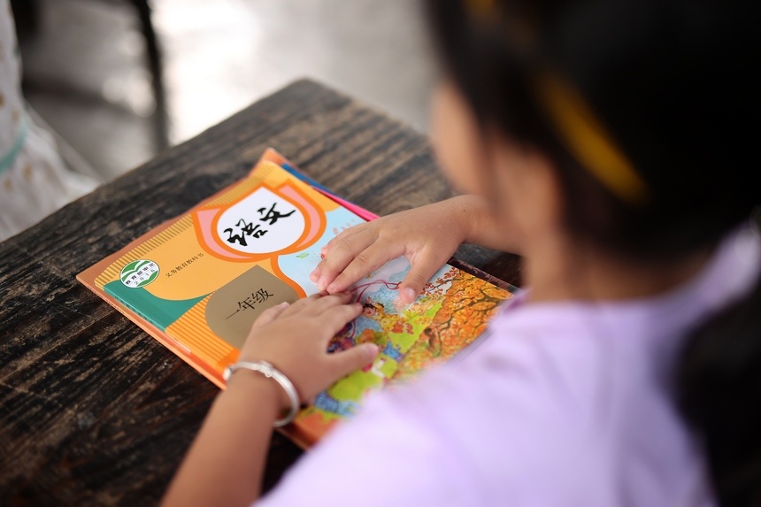 Mo Haifei sets aside her new textbook at the teaching center in Danggan village, Paidiao town, Danzhai county in southwest China's Guizhou Province on Sept. 1, 2021. (Photo/People's Daily Online)