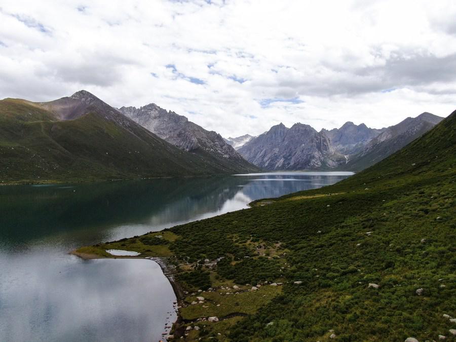 Aerial photo taken on July 22, 2019 shows a Chinese scientific expedition team taking a boat to the main area of Lake Yamzbog Yumco for survey in Shannan, southwest China's Tibet Autonomous Region. (Xinhua/Jigme Dorje)