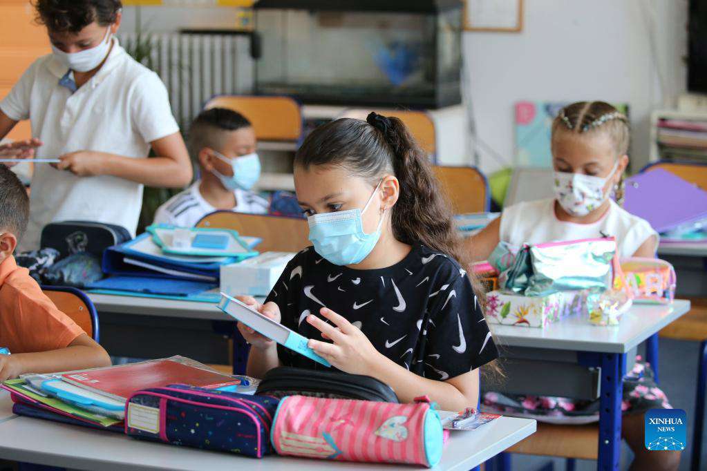 Students are seen in a classroom at Fontonne school on the first day of the new school year in Antibes, southern France, on Sept. 2, 2021. (Photo by Serge Haouzi/Xinhua)