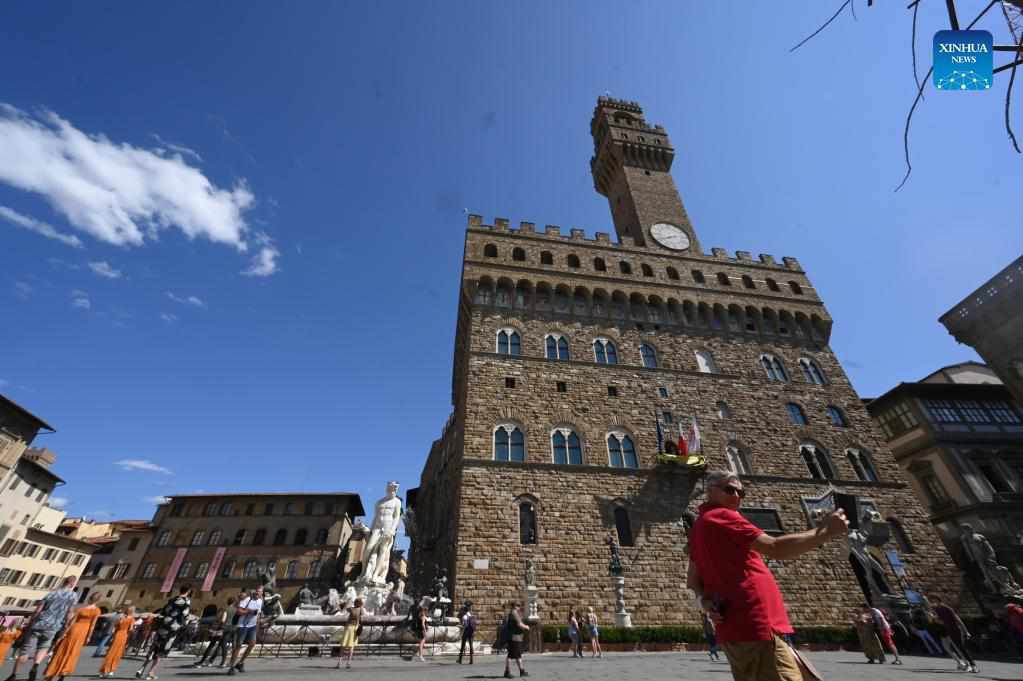 Tourists walk at Piazza della Signoria in Florence, Italy, on Sept. 2, 2021. (Photo by Alberto Lingria/Xinhua)