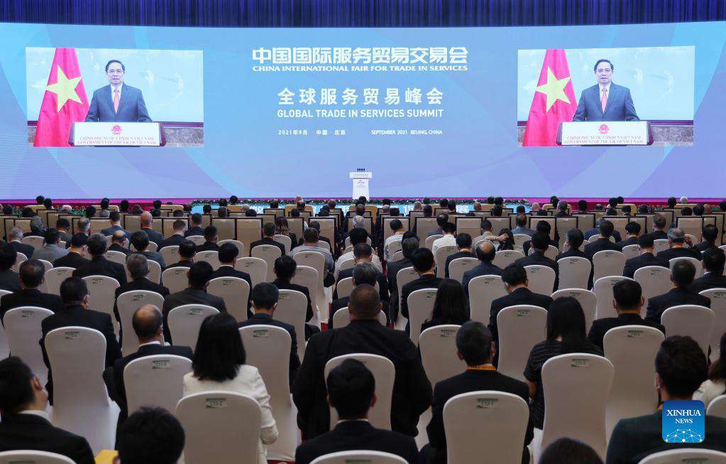 Vietnamese Prime Minister Pham Minh Chinh addresses the Global Trade in Services Summit of the 2021 China International Fair for Trade in Services via video, Sept. 2, 2021. (Xinhua/Xing Guangli)