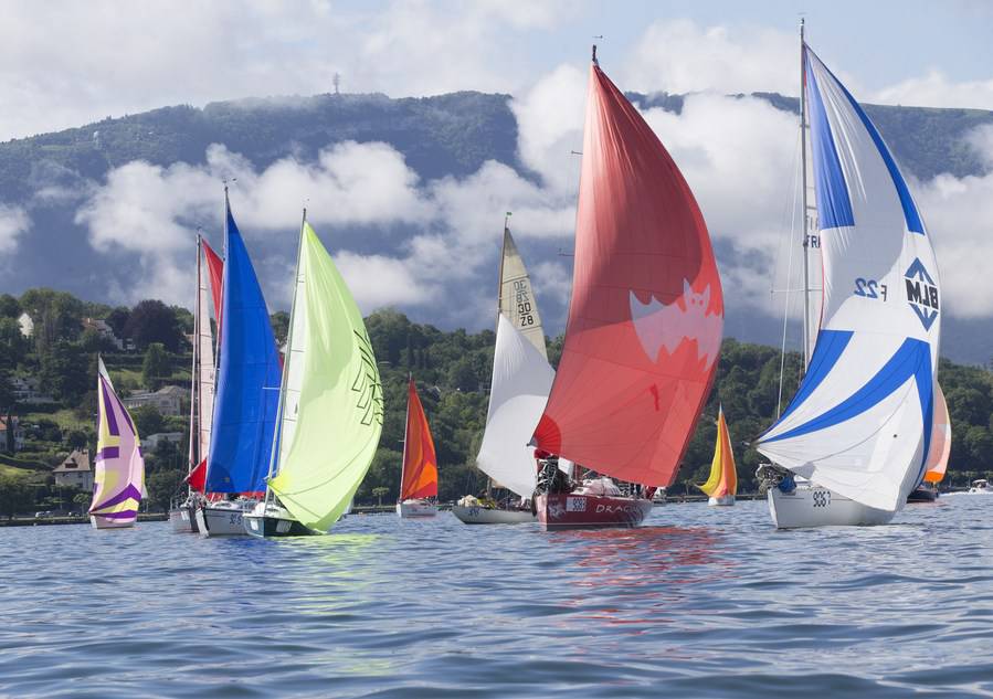 Sailboats compete during the "Bol d'Or" sailing race in Geneva, Switzerland, June 15, 2019. (Xinhua/Xu Jinquan)
