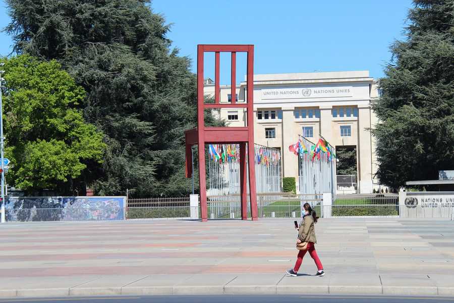 A pedestrian walks past the Palais des Nations in Geneva, Switzerland, April 14, 2020. (Xinhua/Nie Xiaoyang)