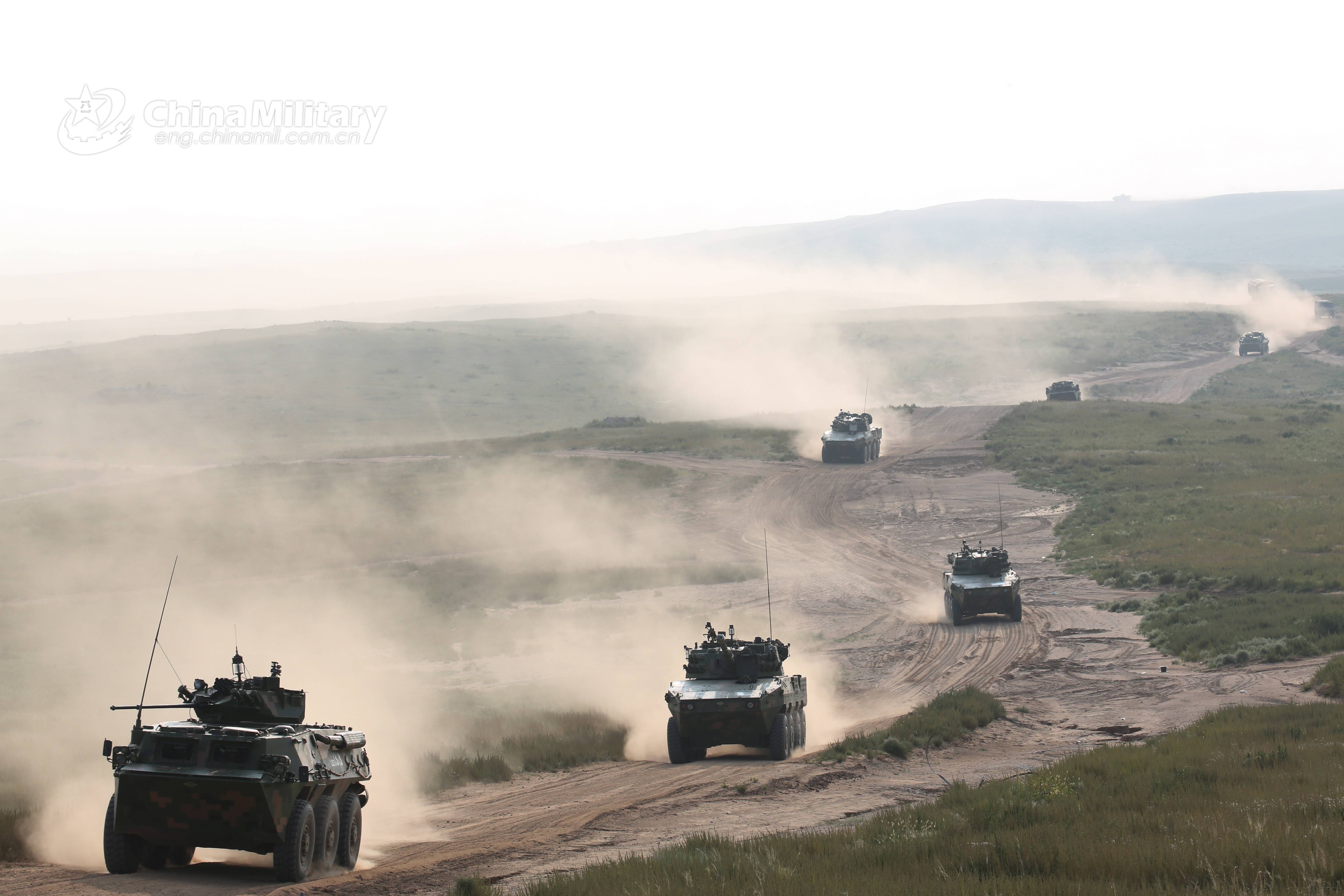 A group of armored vehicles attached to a combined arms brigade under the PLA 81st Group Army maneuver on dirt roads in speed to a designated training base for a tactical test on August 12, 2021. (eng.chinamil.com.cn/Photo by Xue Wei)