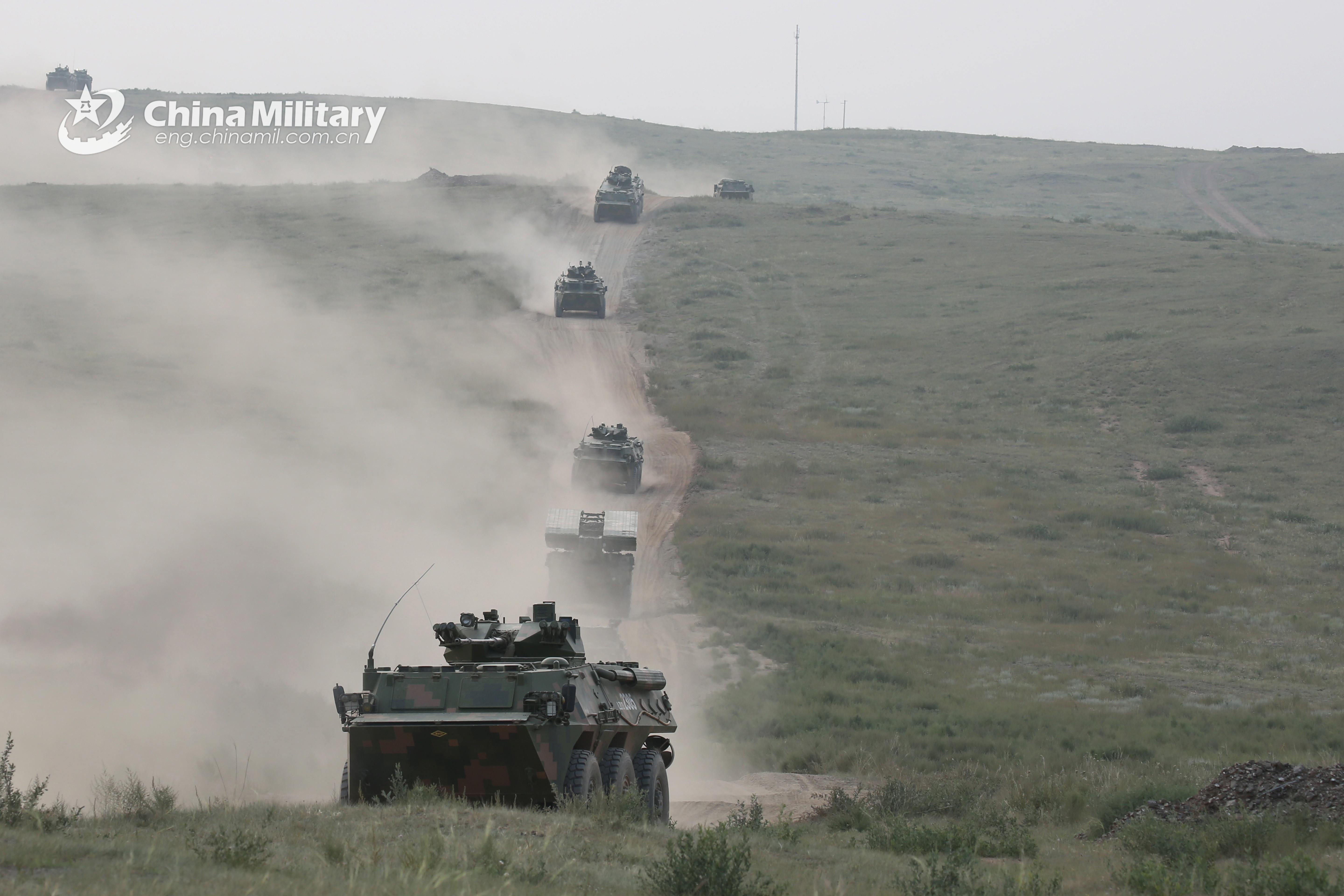 A group of armored vehicles attached to a combined arms brigade under the PLA 81st Group Army maneuver on dirt roads in speed to a designated training base for a tactical test on August 12, 2021. (eng.chinamil.com.cn/Photo by Xue Wei)