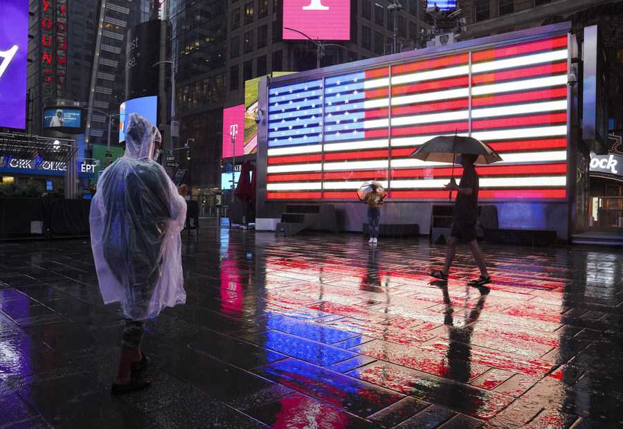 People are seen in the rain caused by tropical storm Henri, in Times Square in New York, the United States, on Aug. 22, 2021. (Xinhua/Wang Ying)
