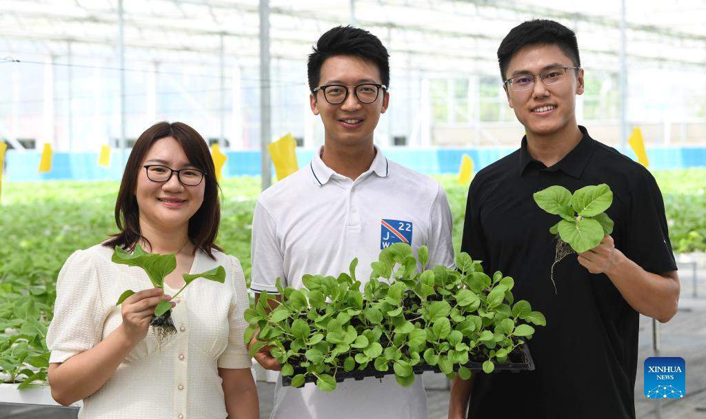 Victor Lo (R), Fung Leung (C) and Mandy Tam pose for a photo with vegetables they grow at their aquaponics production base in the national agricultural demonstration zone in Kaiping City, Jiangmen, south China's Guangdong Province, on Sept. 2, 2021. Victor Lo, Fung Leung and Mandy Tam, all born in the 1990s in Hong Kong, south China, came to the Kaiping national agricultural demonstration zone for their aquaponics research. Aquaponics is a forefront agricultural technology that combines fish-farming and vegetable-gardening, noted for its organic and eco-friendly production cycles, high output, and low energy consumption. With five years of research, the team managed to crack quite a few bottlenecks in the field and applied for nearly 10 patents. Thanks to support from the demonstration zone, they started an aquaponics production base and incorporated their own business. To date, the base annually yields some 300 tonnes of organic vegetables, most of them sold to Hong Kong. The trio said they owe their success to the development of the Guangdong-Hong Kong-Macao Greater Bay Area, and have full confidence in its future. (Xinhua/Deng Hua)