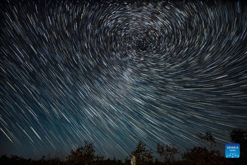 Photomontage taken on Sept. 1, 2021 shows the star trails over the Wudalianchi Geopark in Heihe, northeast China's Heilongjiang Province. The Wudalianchi Geopark is famed for its volcanoes and hot springs. It has 14 volcanoes and five major volcanic barrier lakes. (Xinhua/Xie Jianfei)