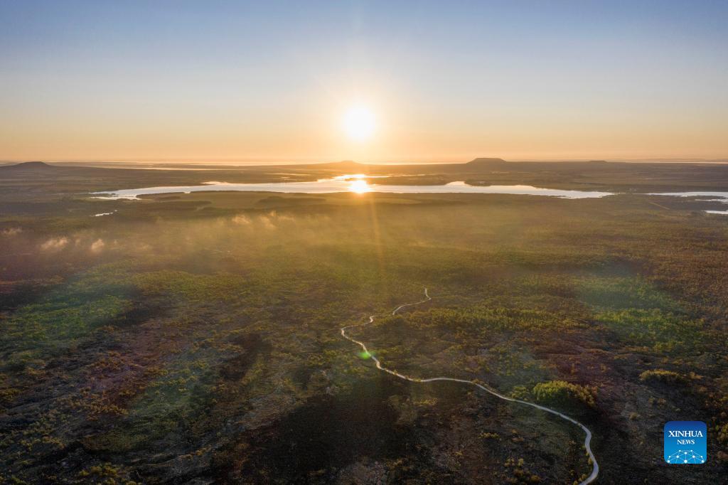 Aerial photo taken on Aug. 31, 2021 shows the stunning view at sunrise in the Wudalianchi Geopark in Heihe, northeast China's Heilongjiang Province. The Wudalianchi Geopark is famed for its volcanoes and hot springs. It has 14 volcanoes and five major volcanic barrier lakes. (Xinhua/Xie Jianfei)