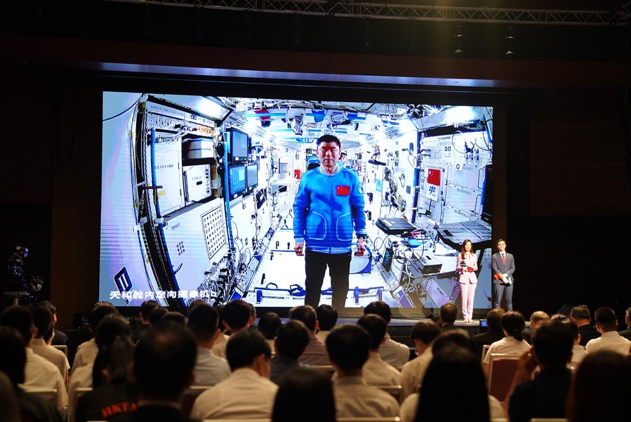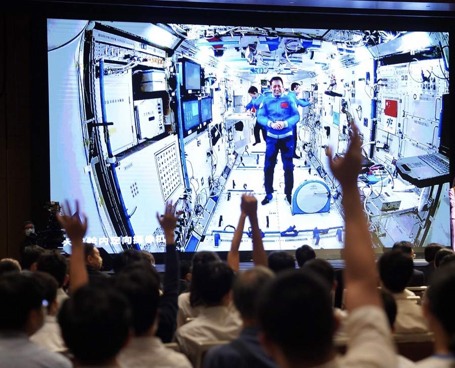 The astronauts in the Tiangong space station answered questions from the youngsters and showed them how to conduct experiments, do exercise and drink water in a weightless environment in the real-time video chat.