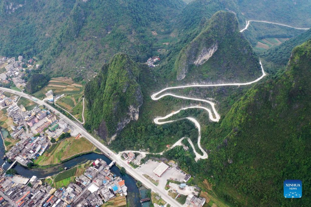 Aerial photo taken on Oct. 28, 2020 shows mountain roads in Daxing Township of Du'an Yao Autonomous County, south China's Guangxi Zhuang Autonomous Region. Du'an is known as the "rocky kingdom" as 89 percent of its administrative region is covered by karst mountains. Poor transportation infrastructure blocked people from the outside and trapped the mountain dwellers in extreme poverty for generations. In recent years, Du'an has invested a lot in upgrading roads in rural areas. The county has seen an expanded road network. As China advances rural vitalization following its eradication of absolute poverty, improved rural roads have helped farmers dispatch their goods and brought tourists and other resources, facilitating the development of industries including e-commerce, tourism and agriculture with local characteristics. (Xinhua/Lu Boan)