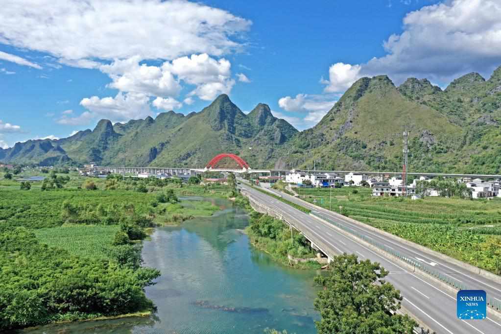 Aerial photo taken on Aug. 31, 2021 shows a high-speed railway under construction and an expressway in Gaoling Township of Du'an Yao Autonomous County, south China's Guangxi Zhuang Autonomous Region. Du'an is known as the "rocky kingdom" as 89 percent of its administrative region is covered by karst mountains. Poor transportation infrastructure blocked people from the outside and trapped the mountain dwellers in extreme poverty for generations. In recent years, Du'an has invested a lot in upgrading roads in rural areas. The county has seen an expanded road network. As China advances rural vitalization following its eradication of absolute poverty, improved rural roads have helped farmers dispatch their goods and brought tourists and other resources, facilitating the development of industries including e-commerce, tourism and agriculture with local characteristics. (Xinhua/Zhou Hua)