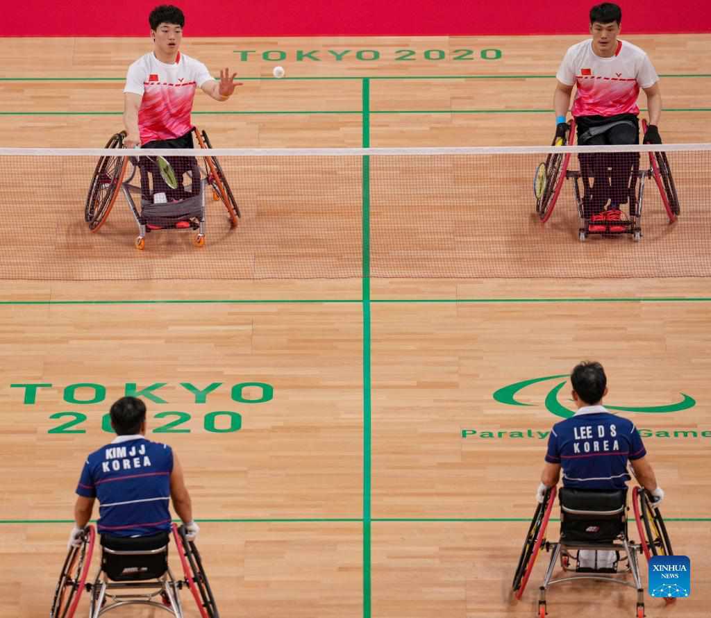 Qu Zimo (L top)/Mai Jianpeng (R top) of China compete during the badminton men's doubles WH1-WH2 gold medal match against Kim Jung Jun/Lee Dong Seop of South Korea at the Tokyo 2020 Paralympic Games in Tokyo, Japan, Sept. 5, 2021. (Xinhua/Hu Huhu)