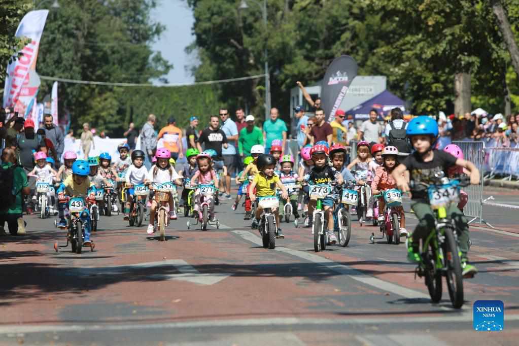 Children participate in a cycling competition in Bucharest, Romania, Sept. 5, 2021. (Photo by Gabriel Petrescu/Xinhua)