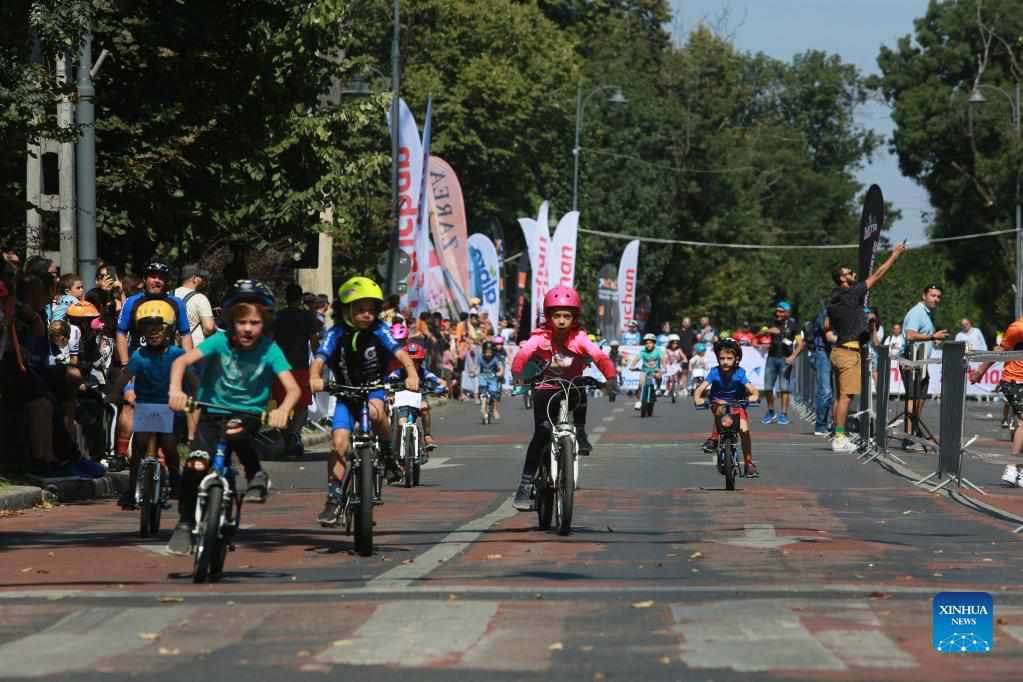 Children participate in a cycling competition in Bucharest, Romania, Sept. 5, 2021. (Photo by Gabriel Petrescu/Xinhua)