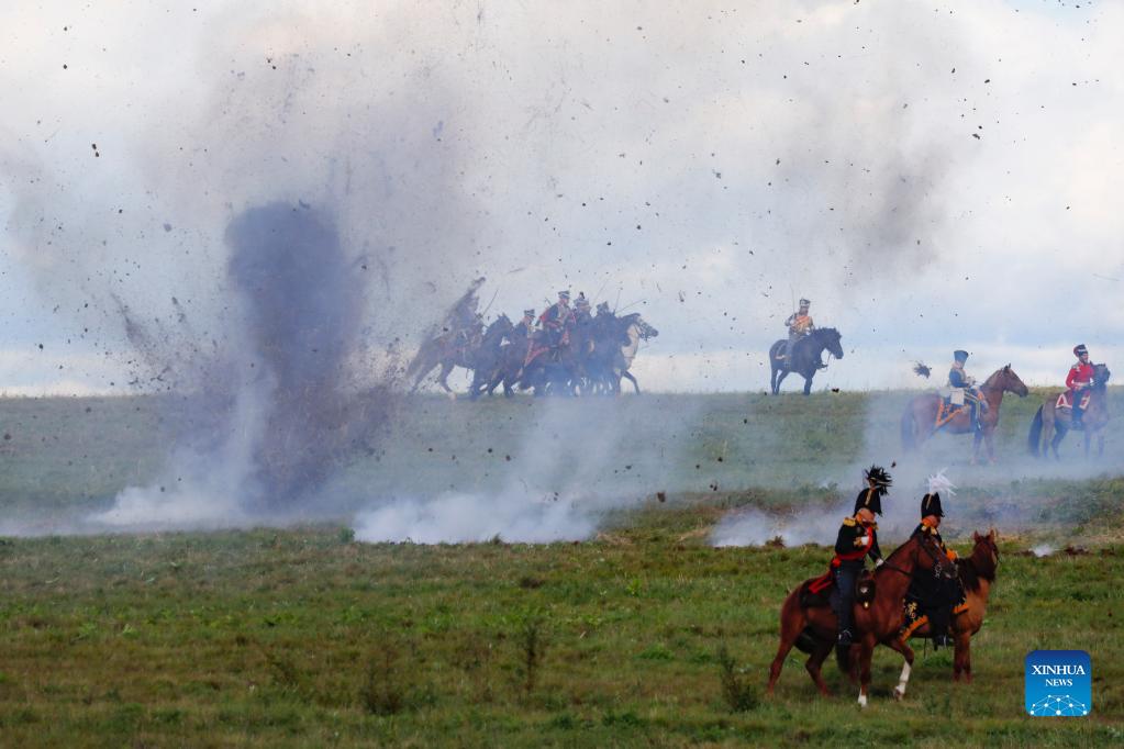 Participants take part in the reenactment of the 1812 Battle of Borodino between Russia and the invading French army near the Borodino village, outside Moscow, Russia, on Sept. 5, 2021. (Photo by Alexander Zemlianichenko Jr/Xinhua)