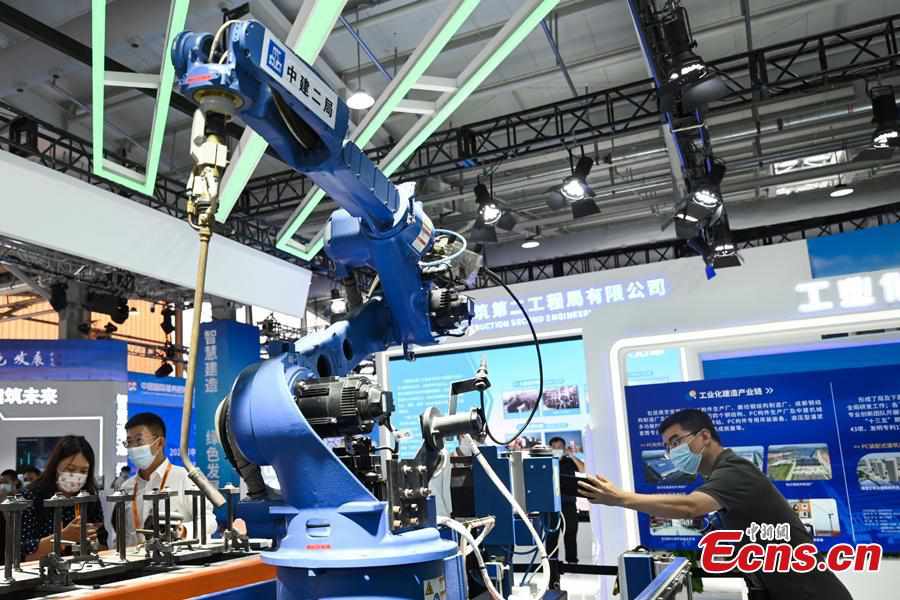 A staff member demonstrates a welding robot during the 2021 China International Fair for Trade in Services (CIFTIS) in Beijing, Sept. 5, 2021. The CIFTIS opened both offline and online on Thursday and will close on Tuesday in Beijing. (Photo: China News Service/Zhang Xinglong)
