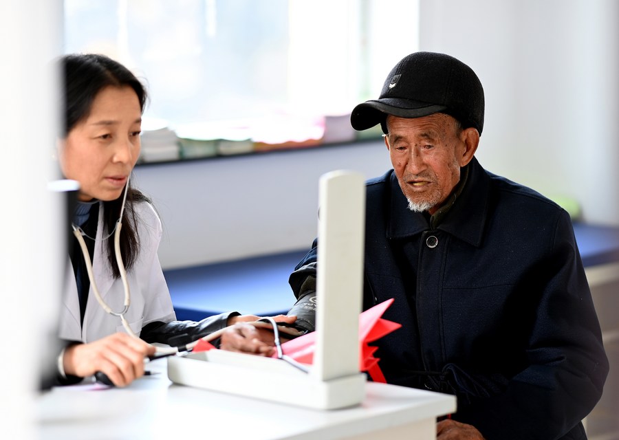 Liu Qingji measures his blood pressure at a health service center of a residential compound for relocated villagers in Yukou Town of Fangshan County, north China's Shanxi Province, March 9, 2021. (Photo by Liu Liangliang/Xinhua)